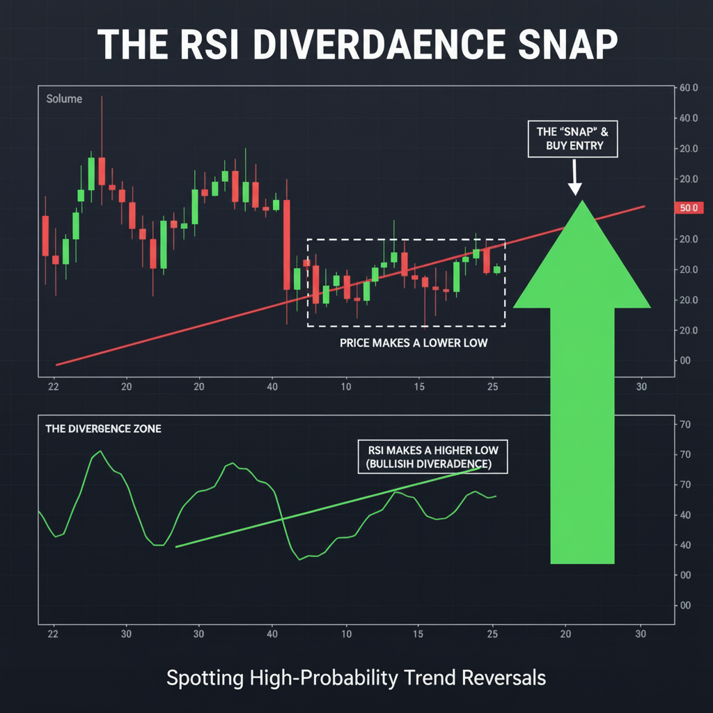 • The Divergence: Look at the RSI. If the price made a “Higher High” but the RSI made a “Lower High,” this is Bearish Divergence. The buyers are tired.