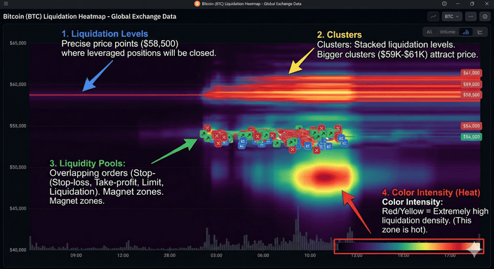 A liquidation heatmap includes several elements that work together to show where the most important activity is concentrated: