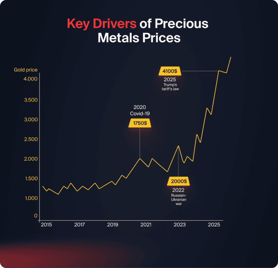 Precious metals become more attractive when real yields fall. Lower interest rates reduce the opportunity cost of holding non-yielding assets such as gold. This dynamic played out in 2024–2025, with gold trading above $4,000/oz sooner than expected on the back of expectations for rate cuts.