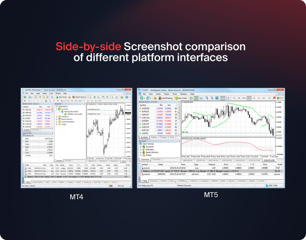 MT5 features multi-asset trading alongside forex, such as stocks, commodities, and cryptocurrencies, while MT4 primarily involves forex. MT5 offers more sophisticated technical indicators (38 vs 30), additional timeframes, and improved backtesting capabilities with multi-currency support. MT4 still boasts a wider community following with additional third-party indicators and expert advisors in existence.