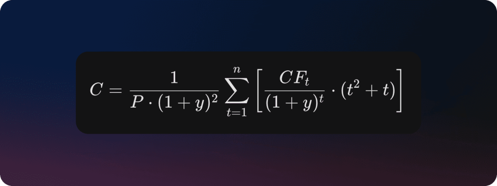 While most trading platforms (like Bloomberg or Reuters) calculate this for you, it’s helpful to understand the math. The formula for convexity (C) involves the second derivative of the bond price (P) with respect to yield (y):
