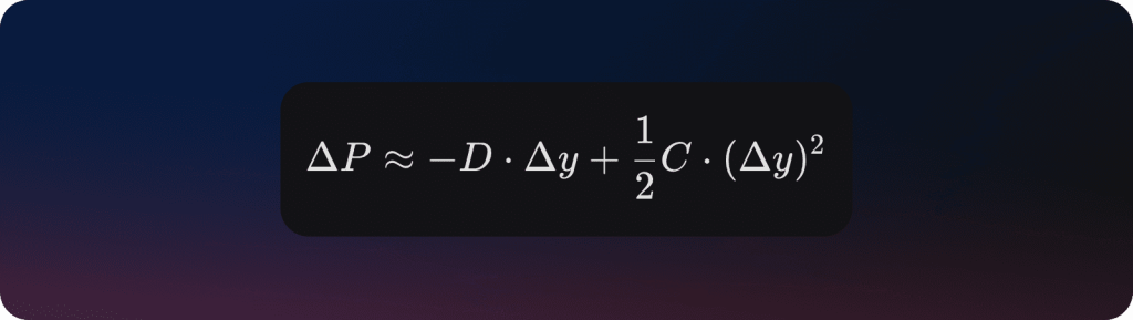- The second part (½ C x Delta(y)^2) is the convexity adjustment. Note that because the change in yield (Delta(y)) is squared, this adjustment is almost always positive for standard bonds, regardless of whether rates went up or down.
