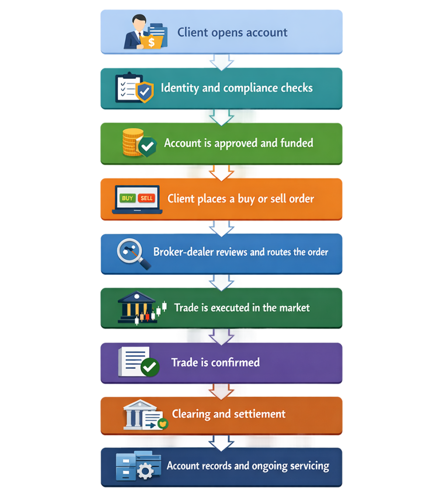 This is why broker-dealers are better understood as operating platforms rather than simple intermediaries. They support the full lifecycle of market access, from account opening to order execution to post-trade operations.